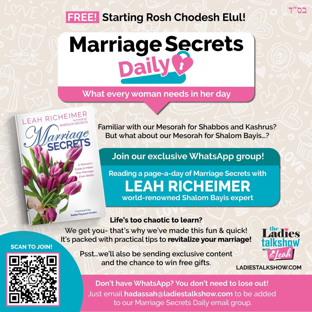 Don’t have WhatsApp? Email hadassah @ ladiestalkshow.com to join the Marriage Secrets Daily email group!